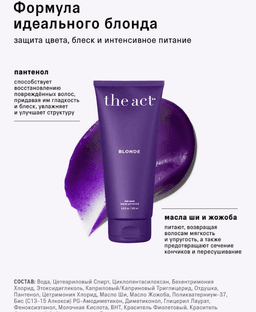 Panetenol we tebigy ýaglar bilen baýlaşdyrylan sowuk sary (blond) saçlar üçin reňk beriji maska artykmaç sarylygy zyýansyzlandyrýar, reňkiň ýagtylygyny goraýar we öwüşginini saklaýar, saçy çyglandyrýar we ýalpyldawuk hem-de ýüpek ýaly edýär. — islenmeýän sarylygy zyýansyzlandyrýar — sowuk öwüşgini we reňkiň ýagtylygyny saklaýar — agyrlaşdyrmazdan çuňňur çyglandyrýar we ýumşadýar — zeper ýeten saçlary dikeldýär, olara ýylmanaklyk we ýalpyldawuklyk berýär — saçlaryň uçlarynyň bölünmeginiň we guramagynyň öňüni alýar — derrew netije: birinji ulanylyşdan soň eýýäm görnüp duran täsir — bir önümde ideg we reňk beriş: saç gurluşynyň dikeldilmegini reňk sazlamasy bilen utgaşdyrýar — öwüşginiň intensiwligine gözegçilik: islenýän reňk beriş derejesini sazlamak aňsat — toplanýan täsir: yzygiderli ulanylanda sowuk öwüşgini güýçlendirýär we saçyň hilini gowulandyrýar Ysy: Çaý güli (Çagyr güli) Göwrümi: 200 ml
