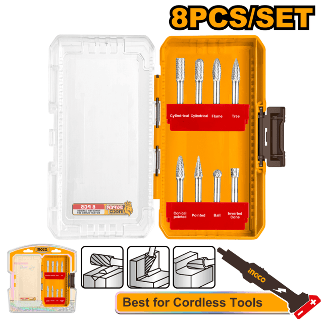 8 sany gaty splawly borfrezalar toplumy Materialy: wolfrom karbidi, goşa dişli Sapjygy: 6 mm Görnüşi: silindr şekilli / agaç şekilli / ýalyn şekilli / meşal şekilli / konis şekilli / ýiteldilen agaç şekilli / şar şekilli / tersine öwrülen konis şekilli Gaty splawly borfrezalar şekil bermek, ýylmamak hem-de ýiti gyralary, tikenekleri we artykmaç materiallary aýyrmak üçin ulanylýar Pnewmatik ýa-da elektrik ýylmaýjy maşynlarynda ulanylýar Goşa blister gabynda gaplanan