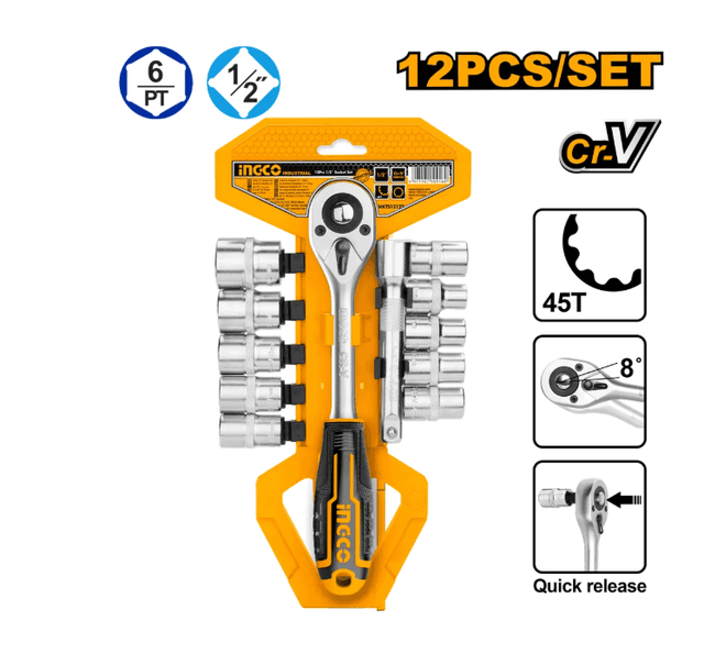 1/2" golowkalar we treşotka toplumy, 12 bölek Toplumda: Toris golowkalar 10 sany: 10, 11, 12, 13, 14, 15, 17, 19, 21, 24 Treşotka açary 45T 1/2": 1 sany Uzatma nasadka 5": 1 sany Materialy: Cr-V ýokary hilli polat 50BV30 Ýylmanan we hromlanan örtük Gaplanyşy: plastik asgyç