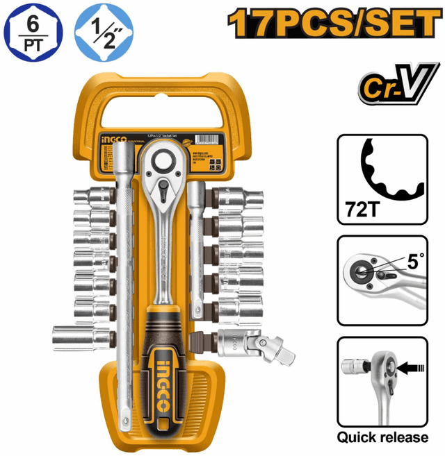 INGCO HKTS12171 INDUSTRIAL 1/2" 10-24 mm 17 sanydan ybarat treşotkaly golowkalar toplumy nurbatly birleşmeleri gurnamak we sökmek üçin ulanylýar. Işçi elementler ýokary hilli 50BV30 hrom-wanadiý poladyndan ýasalandyr. Ýokary gatylyk derejesi sowuk usulda ýasamak we soňraky termiki işläp taýýarlamak arkaly gazanylýar. Golowkany çalt boşatmak ulgamly treşotka işde goşmaça oňaýlylyk döredýär, ýokary berk polat bolsa treşotkanyň netijeli we uzak möhletli işini üpjün edýär. Saklamak we daşamak amatly bolar ýaly, gurallar plastik saklaýjyda berkidilendir. Harydyň görnüşi: golowkalar toplumy Birikdiriji ölçegi: 1/2 dýuým Toplumdaky sany: 17 sany Treşotkanyň ölçegi: 250 mm, 1/2, 45T Altyburçly golowkalar: 10, 11, 12, 13, 14, 15, 16, 17, 18, 19, 21, 24 mm 1/2, 125 mm Cr-V uzaldyjy - 1 sany 1/2, 250 mm Cr-V uzaldyjy - 1 sany 1/2" birleşdiriji kardan – 1 sany 1/2" 16 mm şem (sweça) golowkasy – 1 sany Treşotkanyň materialy: ýokary hilli Cr-V + Cr-Mo polady Golowkalaryň materialy: Cr-V 50BV30 Termiki işlenen, hrom örtükli Gaplamasy: plastik asgyç