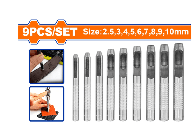 9 sany deri deşiji (proboýnik) toplumy Ölçegi: 2,5, 3, 4, 5, 6, 7, 8, 9, 10 mm Sürülmeýän (knurled) tutawaçly, taplanan we termiki işlenilen korpus Prokladkalarda, deride, plastikde, rezinde, winilde we beýleki ýumşak materiallarda arassa deşik açmak üçin amatly Goşa blister gaplamada gaplanan