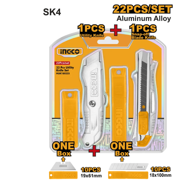 "Kanselýariýa pyçaklarynyň toplumy, 2 sany" Içine alýar: 1 sany alýumin garyndyly uniwersal pyçak 1 sany 18 mm-lik tygy döwülýän alýumin garyndyly pyçak Korpusy alýumin garyndysyndan ýasalan 10 sany 18x100 mm ölçegli tyg 10 sany 61x19 mm ölçegli tyg Slaýderli karton asgyçda gaplanan