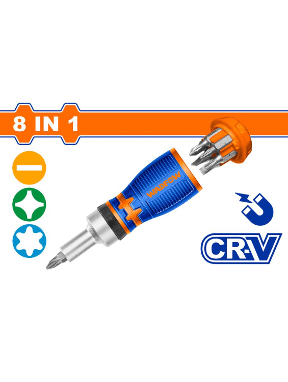 8-i-1-de kelte treşotka mehanizmli towlaýjy toplumy Materialy: Cr-V Toplumda bar: 1 sany treşotka mehanizmli sap, 7 sany 1/4 dýuým * 25 mm towlaýjy nasadkalary Ölçegi: SL5, SL6, PH0, PH1, PH2, T10, T20 Süýşürilýän kartly gaplamada (skolzyashaýa karta)