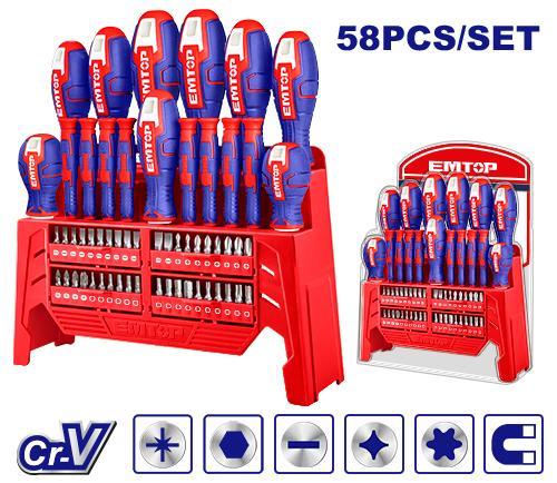 58 sany otwertkanyň we ýokary takyk (presizion) otwertkalaryň toplumy Tutawajyň täze dizaýny Material: CR-V Töwerek görnüşli kesiji ukyby (Kruglyý lezwiýe) Topluma aşakdakylar girýär: 4 sany ýaryk (şlisli) otwertka: SL5.5 x 75; SL6.5 × 38; SL6.5 × 100; SL8 × 150; 4 sany haç şekilli (krestowoý) otwertka: PH1 x 75; PH2 × 38; PH2 × 100; PH3 × 150; 1 sany magnitli çeňňek (steržen): 7 × 100; 1 sany brendiniň eksklýuziw köp funksiýaly plastik saklaýjy bölegi (stoýka); 8 sany ýokary takyk (presizion) otwertka: SL1.5 × 50; SL2.5 × 50; PH000 × 50; PH00 × 50; PH0 × 50; T6 × 50; T8 × 50; T10 × 50; 40 sany otwertka bitleri: SL3 SL3 SL4 SL4 SL5.5 SL5.5 SL5.5 SL6.5 SL6.5 SL6.5; SL7 SL7 PH0 PH0 PH1 PH1 PH1 PH2 PH2 PH3; PZ0 PZ1 PZ2 PZ3 H1.5 H2 H2.5 H3 H4 H5; H5.5 H6 T8 T9 T10 T15 T20 T27 T30 T40; Gaplama: Iki gatly blistede gaplanan (dwoýnoý blister)
