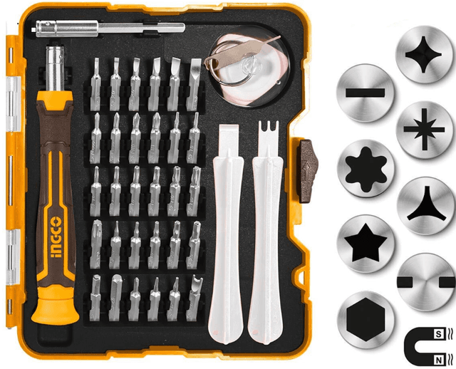 Bitleriň tutawaç-saby 4×60 mm uzaldyjy (magnitli) 30 sany 4×28 mm takyk (presizion) bitler: Göni (SL): 1.5 / 2 / 2.5 / 3 / 3.5 / 4 Atanaklaýyn (PH): 000 / 00 / 0 / 1 Torx (T): 4 / 5 / 6 / 7 / 8 / 9 / 10 / 15 / 20 Altyburçly (HEX): 0.9 / 1.3 / 1.5 / 2 / 2.5 / 3 / 4 Ýörite: Y2, U2.6 Iki sany ýyldyzjygy (Five-Star): 0.8 mm we 1.2 mm Ekranlary aýyrmak üçin wakuum sorujy (prisoska) Korpuslary açmak üçin plastik üçburçluk Iki sany plastik galdyryjy (ryçag) SIM-karty çykarmak üçin iňňe Häsiýetnamalary Görnüşi: takyk atgyfçylar (otwertkalar) toplumy Esbaplaryň sany: 37 Bitleriň materialy: S2 polat (ýokary durnuklylyk) Formaty: dury gapakly we fiksatorly keýs Niýetlenişi: ykjam tehnikalary we elektronika gurallaryny abatlamak Toplumyň agramy: takmynan 250 g Öndüriji: INGCO Öndürilen ýurdy: Hytaý