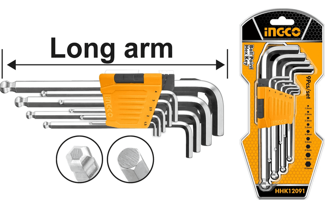 Şar şekilli uly (ball point) 9 sany L-görnüşli altyburçly açarlar toplumy. 25° çenli burç astynda towlamaga mümkinçilik berýär, bu bolsa kyn elýeterli ýerlerde örän amatlydyr. Aýratynlyklary: Görnüşi: Altyburçly açarlar (şar şekilli, uzadylan) Ölçegleri: 1.5 / 2 / 2.5 / 3 / 4 / 5 / 6 / 8 / 10 mm Sany: 9 sany Materialy: Hrom-wanadiý polady (Cr-V) Işlenişi: Hromlanan örtük Görnüşi: Uzyn (uly güýç/ryçag üçin amatly) Gaplanyşy: Plastik saklaýjy
