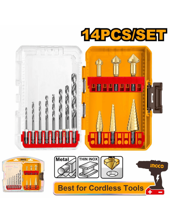 14 sany HSS burgy we basgançakly burgy toplumy 8 sany HSS 4341 burgusy: 2/3/3/4/4/5/6/8 mm, altyburçly sapjykly 3 sany basgançakly burgy: 4-12 mm (5 basgançakly), 4-12 mm (9 basgançakly), 4-22 mm (10 basgançakly) 3 sany zenkowka (çukurlatgyç): 12,4/16,5/20,5 mm Goşa blisterde gaplanan