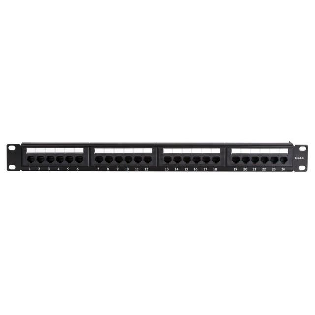 Serwer şkaflarynda we stojkalarynda kabel birikmelerini tertipleşdirmek üçin niýetlenen ýokary hilli kommutasiýa paneli. Cat.6 kategoriýasy gigabit torlarynyň durnukly işlemegini we maglumatlaryň ýokary tizlikde geçirilmegini üpjün edýär. Esasy aýratynlyklary: Port sany: 24 sany RJ-45 öýjügi. Kategoriýasy: Cat.6 UTP (ekranlanmadyk, standart ofis we öý şertleri üçin amatly). Gurluşy: 1U ölçegli, standart 19 dýuymlyk şkaflar üçin. Kontakt görnüşi: Dual IDC (Krone we 110 görnüşli gurnama gurallaryny goldaýar). Artykmaçlyklary: Reňkli belgileme: T568A we T568B standartlaryna laýyklykda ýalňyşsyz gurnamaga mümkinçilik berýär. Çydamlylyk: Kontaktlaryň altyn çaýylan gatlagy poslamagyň öňüni alýar we signal hilini saklaýar. Tertiplilik: Portlar sanlar bilen bellenen we öň tarapynda ýazgy ýazmak üçin ýörite meýdançalar bar.