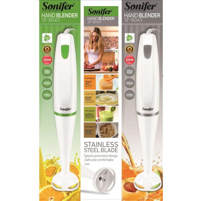 Sonifer SF-8043 — bu poslamaýan polatdan ýasalan, ýokary hilli dizaýna eýe bolan güýçli aşhana guralydyr. Bu blender has uly öndürijilik isleýänler üçin niýetlenen. Ol gök önümleri sanlyja sekundyň içinde ýumşajyk pýure öwürýär, hamyryň düzümlerini garyşdyrýar, öýde taýýarlanylýan souslary we proteinli kokteýlleri taýýarlaýar. Esasy artykmaçlyklary: Ýokary güýji: 600 Wt güýji enjama has agyr işleri ýerine ýetirmäge we adaty modellerden has çalt işlemäge mümkinçilik berýär. Materiallaryň hili: Blenderiň aşaky aýajygy ýokary hilli poslamaýan polatdan ýasalan. Ol dözümlidir, ýokary gyzgynlykdan gorkmaýar we iýmit önümleri bilen reaksiýa girmeýär. Tizlik sazlamasy: Dürli tizlik tertipleri bilen üpjün edilen, bu bolsa önümiň görnüşine görä dogramak prosesini dolandyrmaga kömek edýär. Ergonomika: Tutawajynyň ýörite formasy enjamy elden sypdyrman berk saklamaga we amatly ulanmaga mümkinçilik berýär. Arassalamak aňsatlygy: Onuň aýajygy bir düwme bilen aňsatlyk bilen aýrylýar, bu bolsa ony ýuvmagy ýeňilleşdirýär.