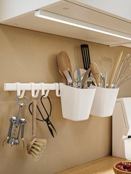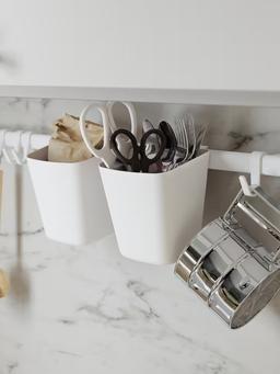 Ak reňkli asgyç, 4 sany krýuçok we 2 sany konteýner bilen enjamlaşdyrylan. Kiçi zatlary tertiplemek we asmak üçin amatly. Aşhana, otag ýa-da ofis üçin peýdaly we amatly çözgüt. Dizaýny ýönekeý we amatly ulanylyşly.
