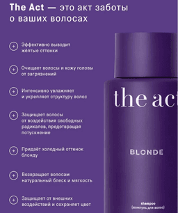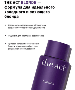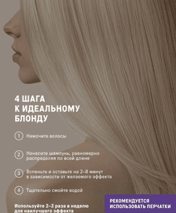 Gialuron kislotasy we pantenol bilen baýlaşdyrylan, açylan (oswetlennyý) we çal saçlar üçin sarylyga garşy täsirli Blonde şampuny arassalaýar, çyglandyrýar, berkidýär we saçy erkin radikallaryň täsirinden goraýar, Ultra-Violet formulasy bolsa islenmeýän sary öwüşginleri aýyrýar we tebigy ýalpyldawuklygyny yzyna getirýär. — islenmeýän sary öwüşginleri intensiw zyýansyzlandyrýar — baş deriniň tebigy gidrolipid deňagramlylygyny saklap, ýuwaşlyk bilen arassalaýar — saçy çuňňur çyglandyrýar — ýalpyldawuklyk we ýylmanaklyk berýär — saçyň ähli görnüşleri üçin: reňklenen, tebigy sary we çal saçlardaky islenmeýän sarylygy aýyrýar — saçy guradyp bilmeýär: iýmitlendiriji formulasy sebäpli saçyň saglygyny saklaýar — ýuwaş formula: ýumşak PAW (ýüzleý işjeň maddalar), sulfatlary we agyr komponentleri saklamaýar, bu ony yzygiderli ulanmak üçin howpsuz edýär Göwrümi: 280 ml