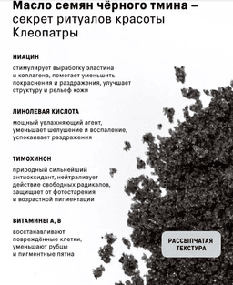 Deňiz duzy we gara zygyr (çerniý tmin) derini inçejik arassalaýar (otşeluşiwaýet), makadamiýa we zeýtun ýaglary iýmitlendirýär, alýoe wera we E witamini bolsa çişmegi aýyrýar we derini goraýar. Gözeneklerden (poralardan) hapalary çykarýar we artykmaç sebumy (deri ýagyny) özüne siňdirýär Antikomedogen we çişmä garşy aýratynlyklara eýe Täze çişmeleriň öňüni alyp, çişmeler bilen netijeli işleýär Sebo-düzgünleşdiriji täsir edýär Epidermisdäki alyş-çalyş proseslerini gowulandyrýar Deriniň täzelenmegini (regenerasiýasyny) we ýara yzlarynyň we postaknäniň bejerilmegini çaltlandyrýar Reňkini we relýefini deňleşdirýär, matirlenýän täsire eýe Tonuslandyrýar we derä ýylmanaklyk berýär Ýeňil limfodrenaž täsirini berýär Ysy: Ysmanaklar (Spesiýalar) Agramy: 300 gr