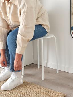 Ak reňkli oturgyç, beýikligi 45 sm. Ýönekeý, çydamly we ýeňil gurluşy bilen öýde ýa-da ofisde giňden ulanylyp bilner. Goýmaga amatly we ýer tygşytlaýar.