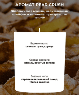 Jakymly armyt pirogynyň täsin ysy we Pear Crush şeminiň meditatiw ýanmagy özüne çekýär, rahatlandyrýar, agzybirligiň şatlykly pursatlaryny ýatladyp, köşeşmek we rahatlyk ýagdaýyny döredýär. — 45 sagada çenli deň we ýuwaş ýanmagy üpjün edýär — giňişligi ýakymly, ýumşak, ýyladyjy ys bilen doldurýar — 30 inedördül metre çenli giňişligi yslandyrýar — aromaterapiýa, rahatlanmak we meditasiýa üçin laýyk gelýär — wegan, howpsuz düzüm — stildeş dizaýn islendik interýere laýyk geler — sowgat üçin ideal — zyýanly maddalary bölüp çykarmaýar Ysy: Armyt, darçyn GÖWRÜMI: 300 ml Meditatiw — rahatlanmaga, içki pikire ünsi jemlemäge gönükdirilen. Wegan — haýwanlardan alynýan maddalary öz içine almaýan. Interýer — jaýyň içki dizaýny.