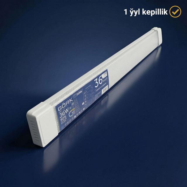 36 Wt kuwwatyndaky G.Ö.R.K. çyzykly LED yşyklandyryjysy — adaty lýuminessent çyralarynyň döwrebap we energiýa tygşytly ornuny tutýan çözgütdir. Inçe korpusy (Batten) we içine gurlan LED-leri saýasynda, ol garaňky nokatlarsyz we ýylpyldawsyz tekiz ýagtylygy üpjün edýär. Sowuk ak ýagtylyk (6500K) iş ýerleri, ofisler, okuw mekdep binalary, koridorlar we kömekçi jaýlar üçin örän amatlydyr. Yşyklandyryjy islendik tekiz ýüzlüge aňsatlyk bilen gurnalýar we uzak hyzmat möhleti bilen tapawutlanýar. Kuwwaty: 36 Wt (pes sarp edijilikli ýokary ýagtylyk). Korpusyň görnüşi: Batten (çyzykly). Ýagtylyk öwüşgini: 6500K (sowuk gündiz ýagtylygy). Artykmaçlyklary: Ýeňil gurnama, bada-bat ýanmak we gürpüdisiz işlemek.