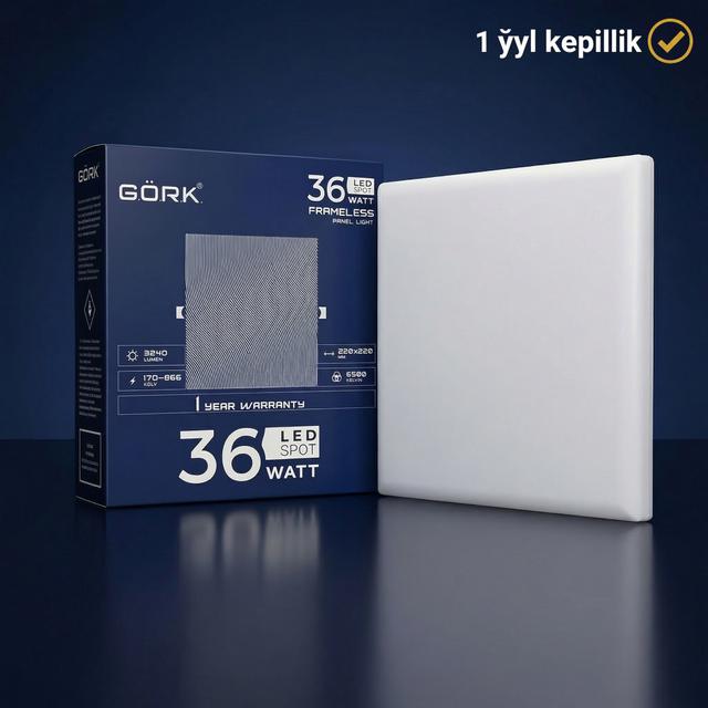 G.Ö.R.K. Frameless seriýasynyň 36 Wt kuwwatyndaky örän güýçli kwadrat yşyklandyryjysy — binagärlik estetikanyň we maksimal ýagtylygyň utgaşmasydyr. Görünýän çäkleriň bolmazlygy (ramaýsyz dizaýn) yşyklandyryjyny potologa ornaşdyrylan döwrebap "ýagtylyk kubuna" öwürýär. 36 Wt ýokary kuwwaty iri göwrümli obýektleri: giň zallary, loftlary, döwrebap ofisleri we söwda pawilýonlaryny netijeli yşyklandyrmaga mümkinçilik berýär. Sowuk ak ýagtylyk (6500K) interýerdäki her bir jikme-jigiň kämil görünmegini we kristal durulygy kepillendirýär. Kuwwaty: 36 Wt (uly meýdançalar üçin maksimal ýagtylyk). Görnüşi: Frameless (ramaýsyz / bildirmän gurnalýan). Görnüşi: SQ-Spot (kwadrat). Ýagtylyk öwüşgini: 6500K (sowuk gündiz ýagtylygy). Aýratynlyklary: Panorama yşyklandyryş, giňişligi wizual artdyrmak we netijeli sowadyş.