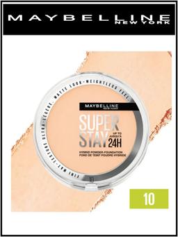 Aýratynlyklary Reňk: №10 Göwrümi: 9gr Düşündiriş Bir önümde pudra we tonal krem - “Maybelline Super Stay 24H” Hybrid Powder-Foundation 24 sagada çenli kemsiz örtügi we çydamlylygy isleýänler üçin niýetlenendir. Matdan ýasalan ultra-ýeňil dokumasy kemçilikleri gizleýär, deriniň reňkini düzýär we ýüzünde duýulmaýar. Täze döredilen gibrid formula, tonal kremiň berkligini we pudranyň howasyny birleşdirýär, maska effekti bolmazdan ajaýyp makiýažy üpjün edýär. Çyglylyga çydamly, gündiz togalanmaýar ýa-da solmaýar. Ýokary pigmentli tonal krem deň paýlanýar, derini derrew birleşdirýär we ajaýyp täsir edýär. Ulanyş tertibi Tebigy örtmek üçin gury ýa-da has galyň netije üçin çygly ulanyň. Önümi deriniň üstünde deň paýlamak üçin gubka ýa-da çotga ulanyň.