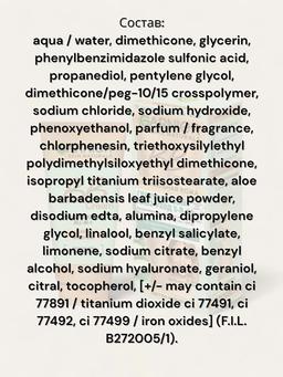 Aýratynlyklary Reňk: СВЕТЛО-БЕЖЕВЫЙ Göwrümi: 50ml Düşündiriş Ýeňil tekstura rahatlyk duýgusyny döredýär we deriniň dem almagyna mümkinçilik berýär. Formula bilen baýlaşdyryldy: Güýçli gidrasiýa üçin gialuron turşusy, ýumşatmak we has rahatlyk üçin aloe wera ekstrakty, tebigy we ýagty netije üçin ultra inçe mineral pigmentler. BB kremini esas, nemlendiriji, SPF20 goragy hökmünde ulanyň. “BB” kreminiň subut edilen netijeliligi: Deriniň ýüzüniň reňkini derrew deňleşdirýär, ýadawlygyň alamatlaryny ýok edýär, şöhle saçýar, 24 sagat güýçli gidrasiýa, ultramelewşe şöhlelerinden SPF20 goragy. Ulanyş tertibi Adaty nemlendiriji bolşy ýaly her gün derini arassalamak üçin BB kremini çalyň. Has dykyz örtmek üçin kremi gaýtadan çalyň. Uzak wagtlap güne sezewar bolanyňyzda günden goraýjy ulanyň.