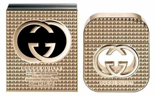 Gucci Guilty Studs Pour Femme Limited Edition (50 ml) taharet suwy — bu asyl Gucci Guilty Pour Femme (2010) atyrynyň ýörite neşiri bolup, gündogar-gülli (Oriental Floral) zenan atyrydyr. Bu çäkli neşir (takmynan 2014-2015-nji ýyllarda çykaryldy) diňe flakonyň dizaýny bilen tapawutlanýar, ol atyryň batyr we pitneçi häsiýetini nygtaýan metall zynjyrlar (studs) bilen bezelendir. Kompozisiýanyň özi bolsa Gucci Guilty-nyň asyl formulasyna wepaly galýar. Başlangyç notlar Gülgün burç, Mandarin, Bergamot Ýagty we ýiti başlangyç. Gülgün burç kompozisiýa oýnakly ýiti tagam we dinamika berýär. Ýürek notlar Siren, Geran, Şetdaly Näzik, ýöne doýgun gülli ýürek. Siren agdyklyk ediji nota bolup, atyra poudraly, biraz bally süýjülik we zenanlyk berýär. Basowy notlar Paçuli, Ambra Ýyly, ýelimli we duýguly esas. Paçuli we ambra atyryň özüne çekiji häsiýetini nygtaýan goýy, gündogar yzy üpjün edýär. Gucci Guilty Pour Femme — bu siren akkordy we ambraly-paçuli esasy bilen aýdyň beýan edilen ýyly, süýjümtik we gurşap alýan atyrdyr. Ol seksual, ýakymsyz we durnukly. Kaşaňlygy we glamury gadyrlaýan zenanlar üçin agşamky ulanmak we salkyn howa möwsümi üçin ideal laýyk gelýär.