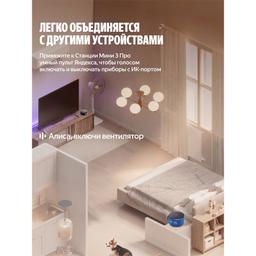 Яндекс Станция Мини 3 Про — первая умная колонка с Алисой, к которой можно подключать дополнительные модули, расширяя её привычные возможности. Слушайте музыку в классном качестве, носите Станцию с собой и превращайте в домашнюю климатическую систему. Ваш ассистент внутри Алиса с искусственным интеллектом в Станции Мини 3 Про умеет так много: она найдёт и включит, что попросите — музыку, аудиокниги, подкасты — и подберёт рекомендации по вашим интересам. Задавайте самые разные вопросы и получайте понятные и подробные ответы. Можете даже давать ей сразу несколько команд — Алиса поймёт их и выполнит, например: «Алиса, включи плейлист для поднятия настроения и сделай звук на максимум». Много пространства для любимой музыки Технические решения Яндекса делают звук в Станции Мини 3 Про удивительно громким, чистым и выразительным. ● Выразительное звучание: специально спроектированный динамик в 18 Вт с неодимовым магнитом и двумя пассивными излучателями усиливает звук и воспроизводит басы от 90 Гц. За счёт этого низкие частоты становятся заметнее, а любимые треки звучат ярче. ● Стереопара: объединяйте две Станции Мини 3 Про в стереопару, чтобы сделать звук в помещении ещё объёмнее. ● Режим Мультирум: включайте музыку на всех Яндекс Станциях в доме одновременно. Это удобно, например, когда перемещаетесь между комнатами. Просто скажите: «Алиса, включи музыку везде». Портативный аккумулятор Дополните Станцию Мини 3 Про портативным аккумулятором — и носите её с собой из комнаты в комнату и пользуйтесь где удобно⁵. Заряда хватит на 7 часов непрерывного прослушивания музыки⁶. Портативный аккумулятор не входит в комплект Яндекс Станции и приобретается отдельно. Управлением умным домом Станция Мини 3 Про поддерживает современные протоколы связи — Wi-Fi®, Zigbee™ и Matter™⁸. Подключайте к ней напрямую умные датчики, выключатели и другие устройства и управляйте ими голосом или с помощью удобных сценариев: «Алиса, выключи свет и включи шум дождя». Свет, который говорит без слов Помимо привычного LED-дисплея, у Станции Мини 3 Про есть анимированная функциональная LED-подсветка. Её свет и цвет сопровождают ваше общение с Алисой и меняются в такт музыке. Режим радионяни Поставьте умную колонку рядом с кроваткой малыша, и Алиса будет передавать все звуки из детской на телефон или другую Яндекс Станцию. Так будет проще услышать, когда ребёнок проснётся или заплачет. Функция «Шёпот» С Алисой можно говорить шёпотом, например, чтобы не разбудить близких. Если обратиться к Алисе шёпотом, она тоже понизит голос — точно так же, как это делают люди. Звонки на Станцию На умную колонку можно звонить из приложений Дом с Алисой или с другой Станции. Это выручит, когда не получается дозвониться на телефоны домашних, и очень удобно, если решили поговорить со всей семьей сразу. Сообщения на Станцию Когда нужно рассказать близким что-то важное, но неудобно звонить, передавайте сообщения на домашнюю колонку прямо из приложений Яндекса: Навигатора, Карт и Дома с Алисой, или между Станциями. Алиса прочитает их своим голосом. Портативный аккумулятор Портативный аккумулятор для Станции Мини 3 Про позволяет переносить умную колонку из комнаты в комнату и брать её с собой куда угодно, чтобы не расставаться с Алисой и любимой музыкой. Легко и надёжно крепится Благодаря магнитн