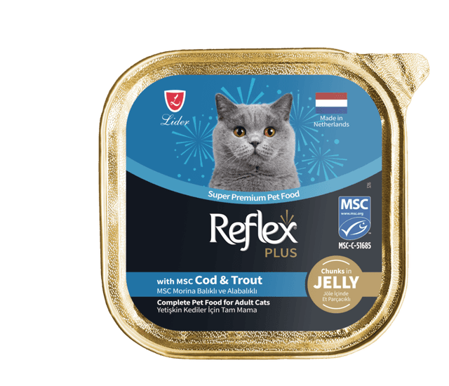 Влажный корм для кошек Reflex Plus с Треской и Форелью в желе с кусочками мяса 85 гр