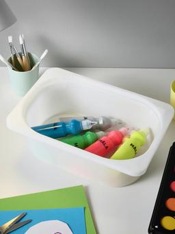 Bu ak reňkli, 20×30×10 sm ölçegdäki saklaýyş gutusy, çaga otaglarynda oýunjaklary, ýazuw esbaplaryny ýa-da beýleki ownuk zatlary tertipli saklamak üçin niýetlenendir. Ýeňil, berk we arassalamaga amatly.